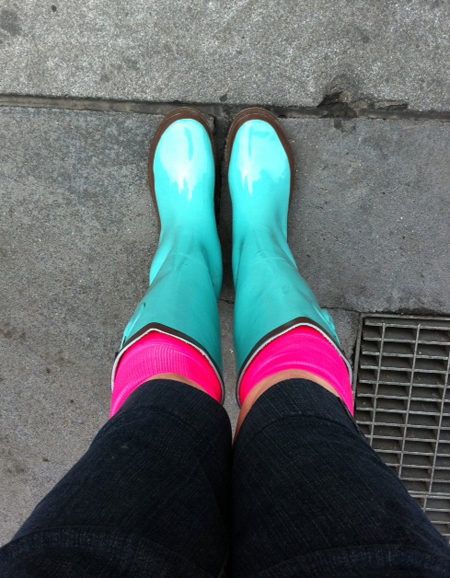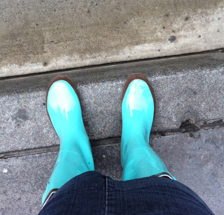 I thought when I bought these rainboots that the cheerful turquoise color would perk up rainy days. But, I was wrong.