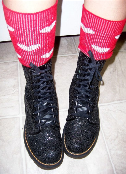 And it’s exactly what I did. Seven years of waiting to go to that school. Four years of cheating my way through high school homework assignments- skimming by with a C average (if I was lucky) just so I could go to FIT. And the very first day? I wore those boots. My glitter Doc Martens. With blue jeans and an oversized hooded red sweatshirt. The boots were pretty muchy and I didn’t want to appear like I was trying too hard on the first day of school. Therefore, the lame red sweatshirt. Always a secret regret. But I did get a compliment on the boots that first day from a stranger. And 17 years later I still remember. Funny how our brains hold onto Muchy memories even when we don’t even realize. I wore those boots to shreds. Literally. They were falling apart aroundmy feet, the fibers disintegrating at wear spots. I went looking online if they still make them. Nope. The few pics online are all of the ‘remember when?” variety. Oh well. What’s past is past.