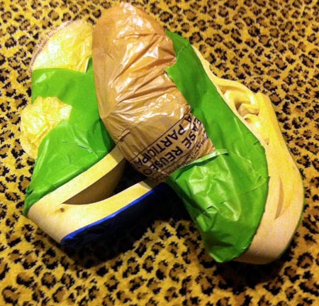 Dennel- I wore them to dinner with my hubby in the city. After we ate I demanded we go on a “stroll”…. we went and went… maybe a mile, because I was loving that people were STARING at my feet as we passed. I was giddy. 🙂 Then I realized we were close to my friend Vadims apartment so I stopped by knowing that if anyone would appreciate them, it’s him. He took a picture to send his MOM and then provided me with half a dozen bandaids for my half a dozen blisters.