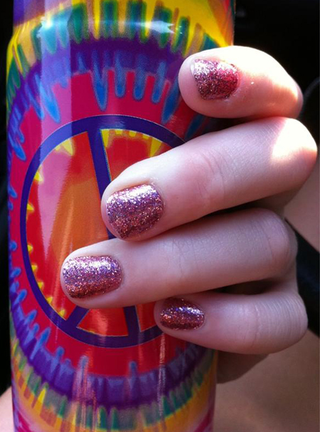 Sarah's Muchness Pic of the day, Day 2! "Tie dye and glitter! Why should I act my age? I think that a twenty year old has just as much motive as a four year old to wear glitter on her nails and drink out of a tie dyed thermos. Who is it that determines how my age should act? Oh yeah… me. 😉 So, from now on I’m going to let my freak flag fly. Tie Dye and glitter is just what I need to get through the day. Today is the first day all week that I have worked from 8-6 and have not felt exhausted once. Looking at my gorgeous finger nails makes me smile, which is enough to keep pushing.props to: Sally Hanson nail stickers & CVS for selling this awesome tie dyed water bottle. get it.